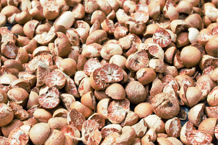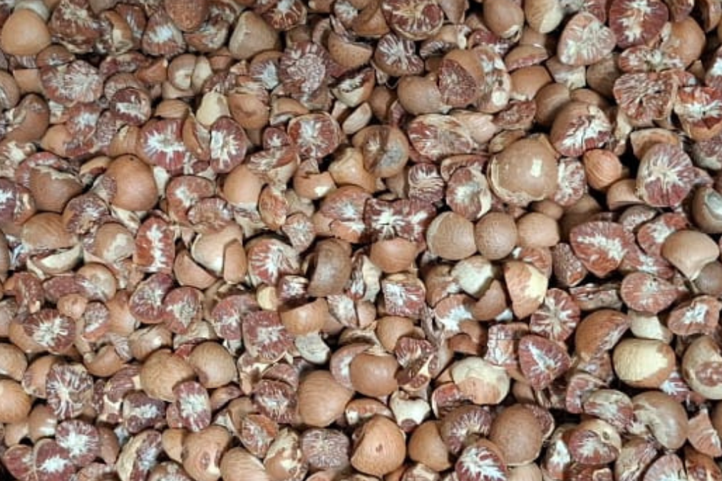 التعريف: بذور كاملة مجففة من شجرة جوز التنبول تم تقسيمها إلى أنصاف بعد الحصاد والتجفيف