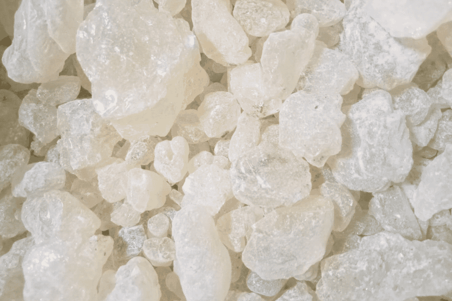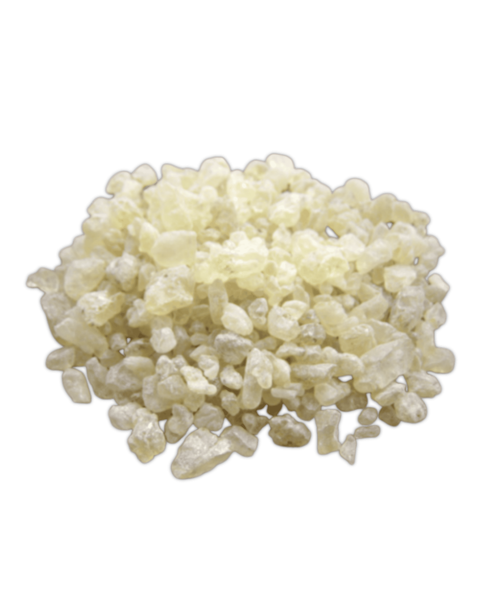 - Penampakan: Bongkahan resin buram (opaque) dengan tekstur keras dan permukaan tidak beraturan.