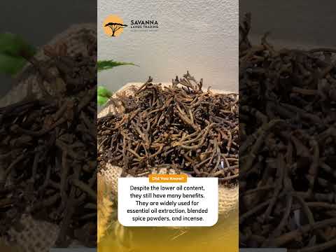 - Appearance: Dried clove stems, slender and woody, fairly uniform, free from excessive dust and foreign materials